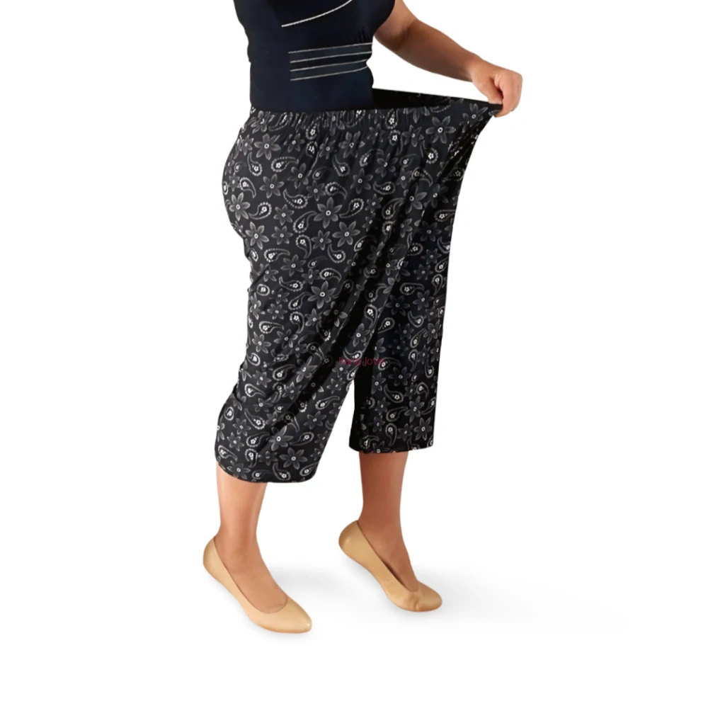 Stylové a pohodlné černé 3/4 kalhoty s bílým květinovým vzorem jsou perfektní volbou pro ženy s plnějšími tvary. Díky vysoké elasticitěa pásu na gumu se kalhoty přizpůsobí vaší postavě, nikde netlačí a jsou ideální na každodenní nošení – doma, venku i na cestách. Jsou lehké, prodyšné a příjemné na těle – tyto nadměrné dámské kalhotyve tříčtvrteční délce zaručí maximální pohodlí i v teplejších měsících. Díky jemnému květinovému vzoru navíc působí elegantně a snadno se kombinují s tunikou, trikem nebo dlouhou halenkou. Dostupné v nadměrných velikostech až do 7XL.